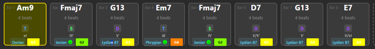 この辺を便利にするプラグインやソフトウェアは色々世の中にあるのだが、結局自作してしまった。調とテンポが選べて、マウスポチポチでコードと長さを選べて、プレビュー機能とmidi出力と途中保存・読み込み機能がついてるWebアプリみたいなのはclaudeくんがシュッと書いてくれてしまったので、このフェーズではそれを愛用している。