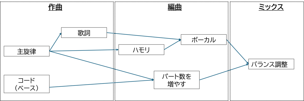 作曲と編曲とミックスの3フェーズに分かれており、作曲フェーズの主な成果物は主旋律とコード(加えてベース音)、そし歌詞が特定されていることである。