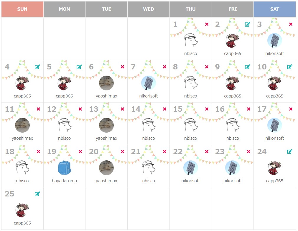 capp365.hateblo.jp お絵描き一ヵ月続けた話。これアドベントカレンダーのネタとしてやっていたわけではなく、ただの奇行だったのですが、いざアドベントカレンダー始まったら今年はネタ仕込む余裕が全くなくて、やっててよかったなぁと思いました。アイスブレイクとのシナジー的な観点でも◎。
